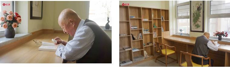 在烏蘭美康養(yǎng)院的圖書(shū)室里,人們常常會(huì)看到一位老人拿著放大鏡在埋頭讀書(shū),一讀就是2小時(shí)。談及爺爺?shù)拈喿x愛(ài)好,老人家興奮地說(shuō):“我每天早上起來(lái),在康養(yǎng)院內(nèi)散散步。九點(diǎn)左右就去康復(fù)訓(xùn)練室里用按摩椅活動(dòng)活動(dòng)筋骨,九點(diǎn)半左右我就去圖書(shū)室了,一般看兩小時(shí)的書(shū)。每天中午和晚上睡覺(jué)前,我是一定要看一小時(shí)書(shū)的,這已經(jīng)成為了生活‘必需品’。”不少人感嘆王爺爺?shù)淖月?,他卻打趣道:“我也是勞逸結(jié)合!午睡后,我會(huì)到活動(dòng)室打兩小時(shí)的麻將。”