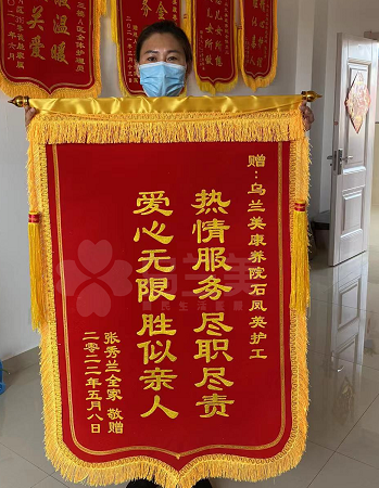 近日,烏蘭美康養(yǎng)院收到了一封致謝院內(nèi)全體工作人員的感謝信和一面送給石鳳英護(hù)理員的錦旗,錦旗上面寫著“熱心服務(wù),盡職盡責(zé),愛心無限,勝似親人”。一句感謝的話語(yǔ),一面肯定的錦旗都承載了老人家屬對(duì)我們服務(wù)的認(rèn)可,讓我們更有一種責(zé)任感和使命感要把這份工作做好。