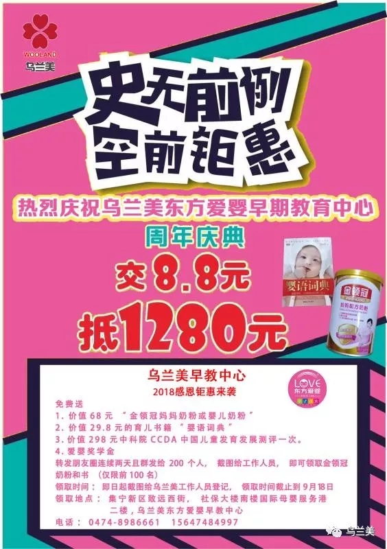 【喜迎中秋】烏蘭美?東方愛嬰早期教育周年慶, 感恩回饋專家咨詢周活動重磅開啟!發(fā)布時間: 2018-09-13 -